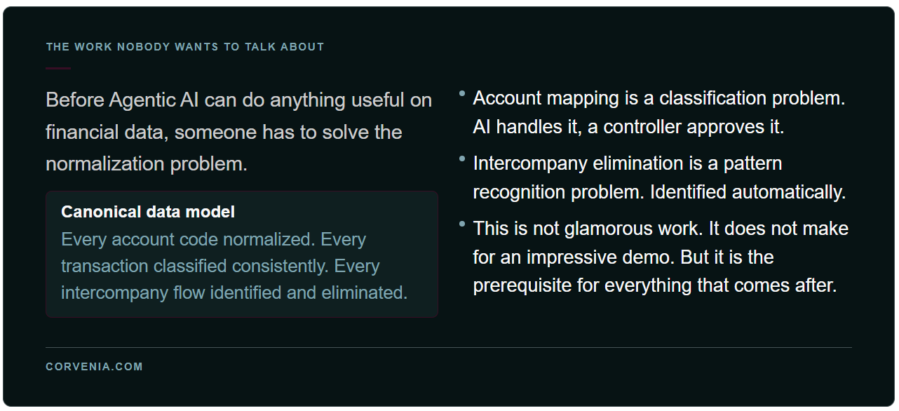 We built the canonical data layer at Corvenia because we had to. You cannot do real-time consolidation across multiple ERPs without it. Every entity connects its ERP, and the data normalizes into a single model automatically. Account mapping is a classification problem. AI handles it, a controller approves it, and it is done in minutes.